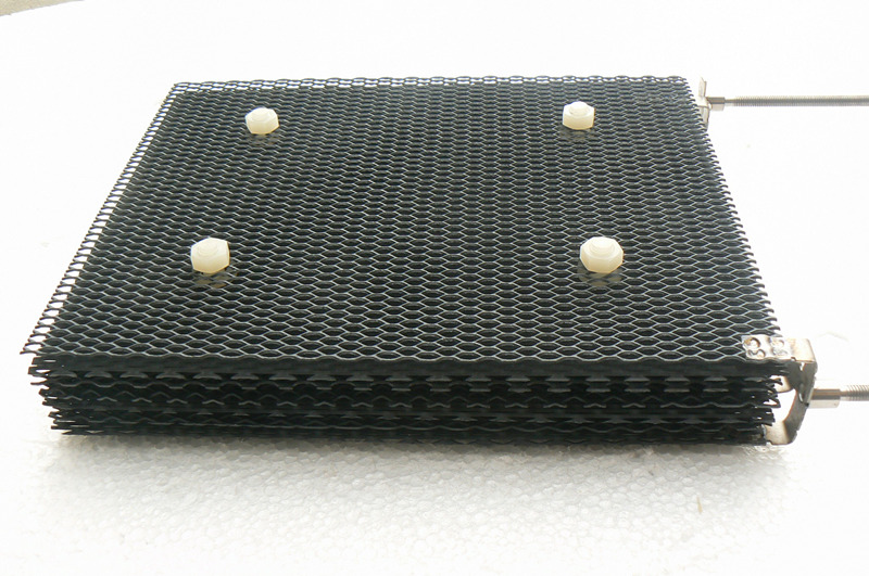 我公司主要針對(duì)此行業(yè),設(shè)計(jì)并研發(fā)了一種具有活化層的銥鉭陽(yáng)極板,并且也申請(qǐng)了實(shí)用新型專(zhuān)利,該陽(yáng)極在鈦基體上涂覆由錫和銻氧化物組成的活化層,一方面能使電解液難以滲透到鈦表面,氧原子或02-離子向鈦基體的擴(kuò)散也受到了阻擋,從而避免了Ti02的生成,同時(shí)也提高了銥鉭涂層的析氧過(guò)電位。主要在有機(jī)廢水處理中體現(xiàn)其獨(dú)特的優(yōu)越性,能使有機(jī)物直接在陽(yáng)極表面被氧化成CO2和水,也防止了原生態(tài)的氧原子進(jìn)入涂層內(nèi)部破壞涂層,從而增強(qiáng)陽(yáng)極使用壽命。